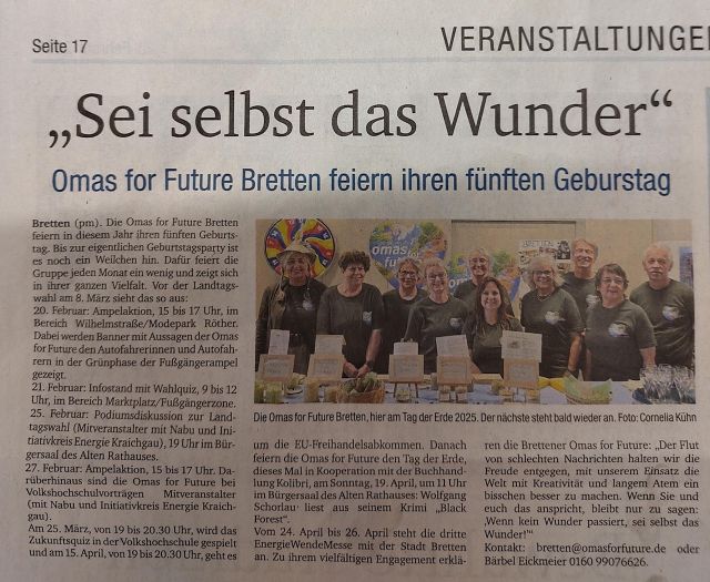 Im November 2021 gründeten Bärbel Eickmeier und Conny Kühn die Regionalgruppe der Omas for Future in Bretten. Daraus entwickelte sich eine sehr aktive Truppe mit etwa 20 Aktivistinnen und Aktivisten.