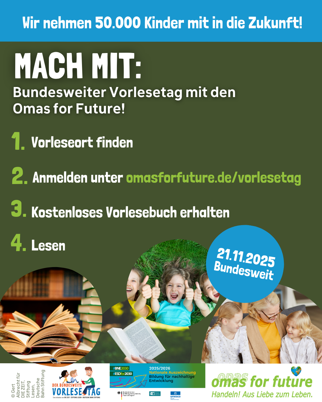 Ihr seid eine Regionalgruppe oder Organisation und möchtet den Vorlesetag vor Ort in Eigenregie organisieren. Ihr sprecht Vorleseorte an und lest dort am 21. November Kindern aus unserem Buch „Oma, erzähl mir von der Zukunft“ vor.